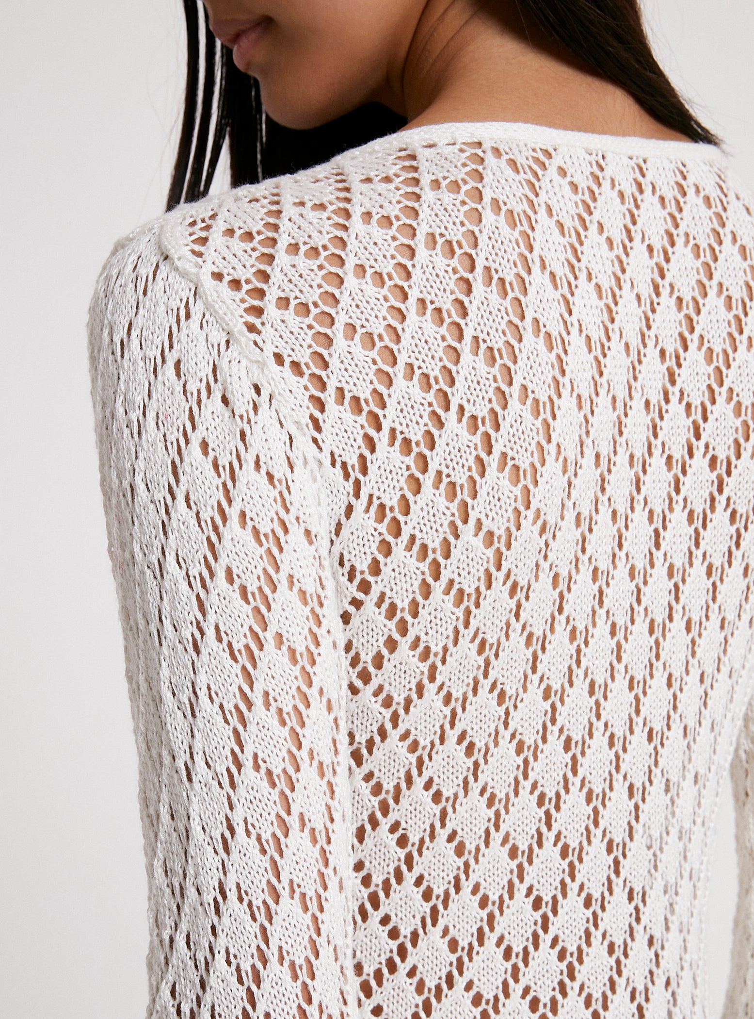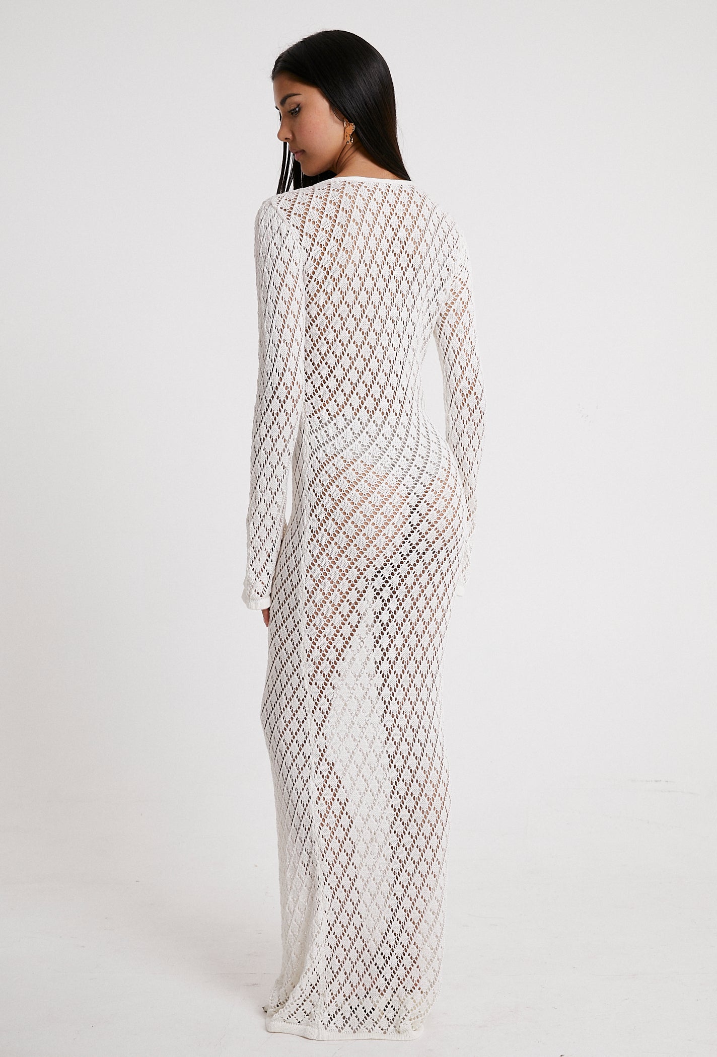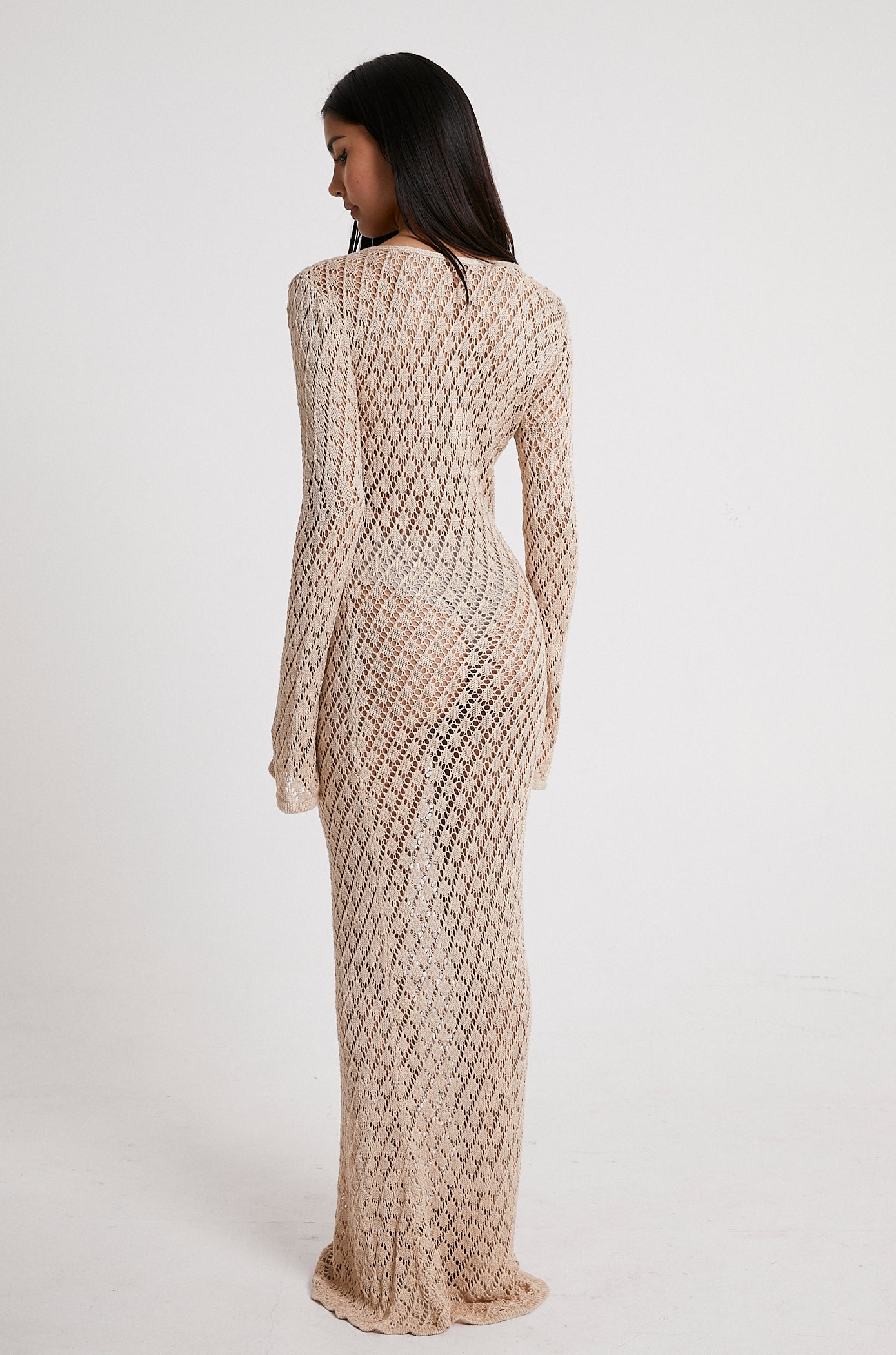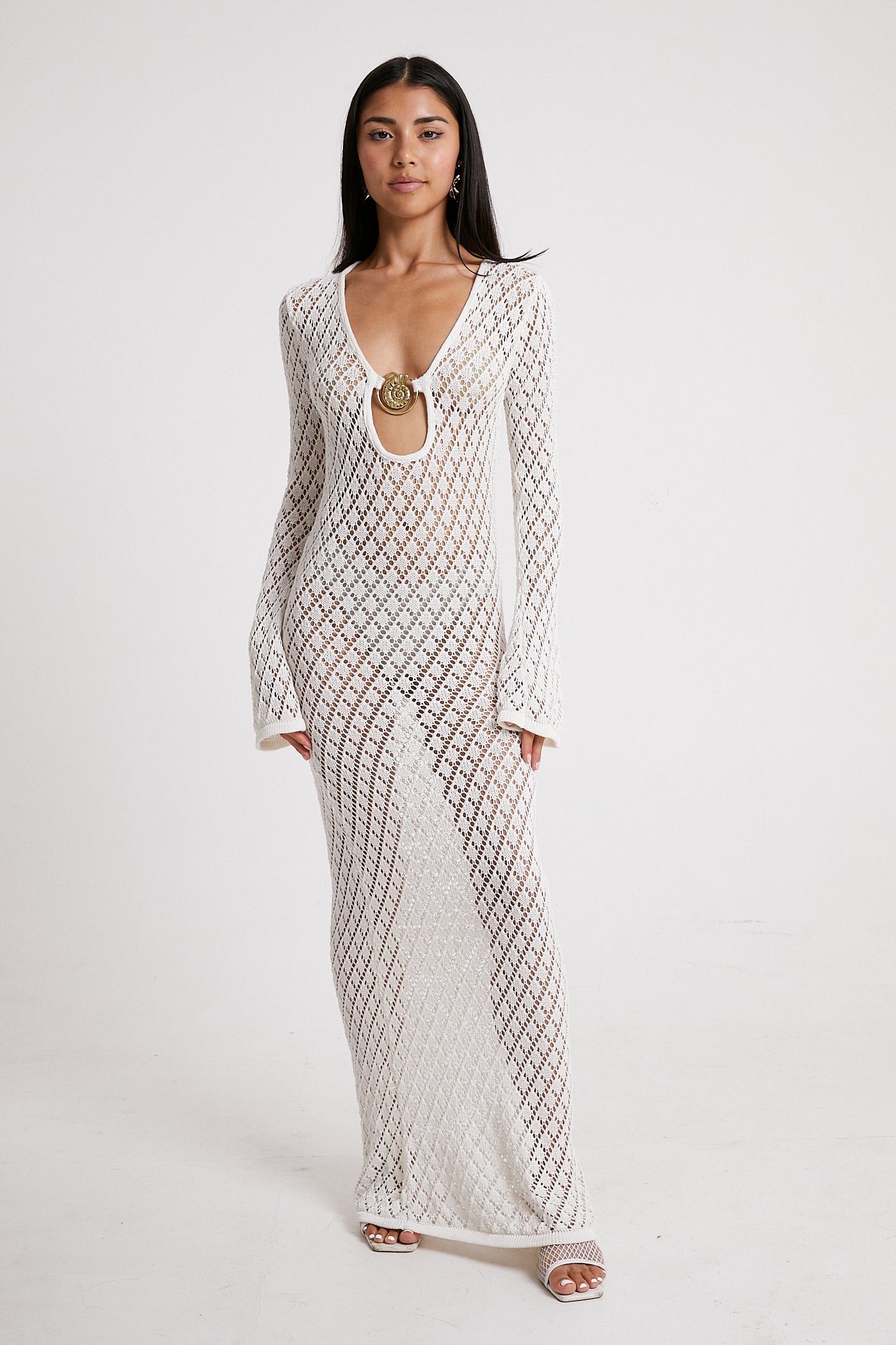 Discover the ultimate statement resort piece, the ST TROPIZ Maxi Knit Dress. Crafted from luxurious 100% rayon, this dress features a flattering silhouette with a deep V-neckline adorned with a gold shell detail. Its modern edge is enhanced by full-length sleeves and subtle cutouts. Perfect for a glamorous and confident look at any destination.